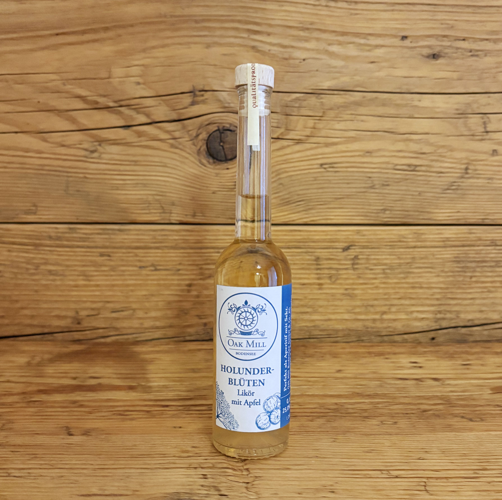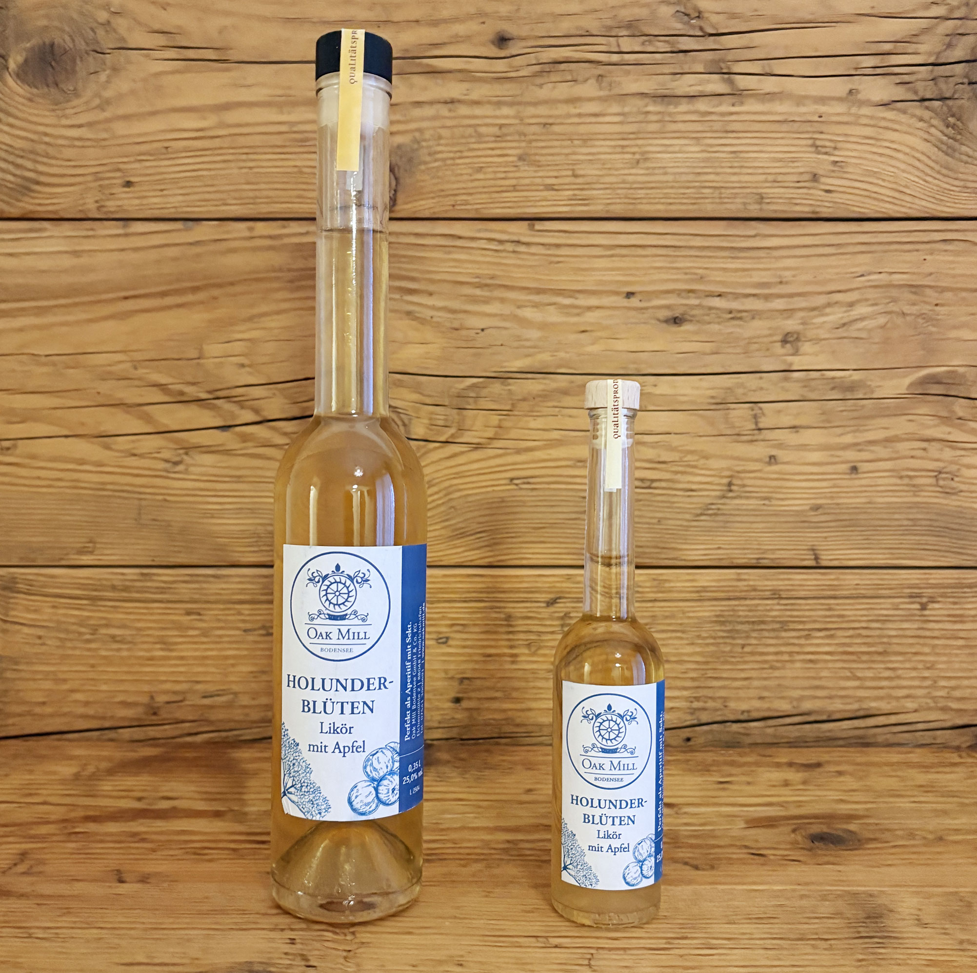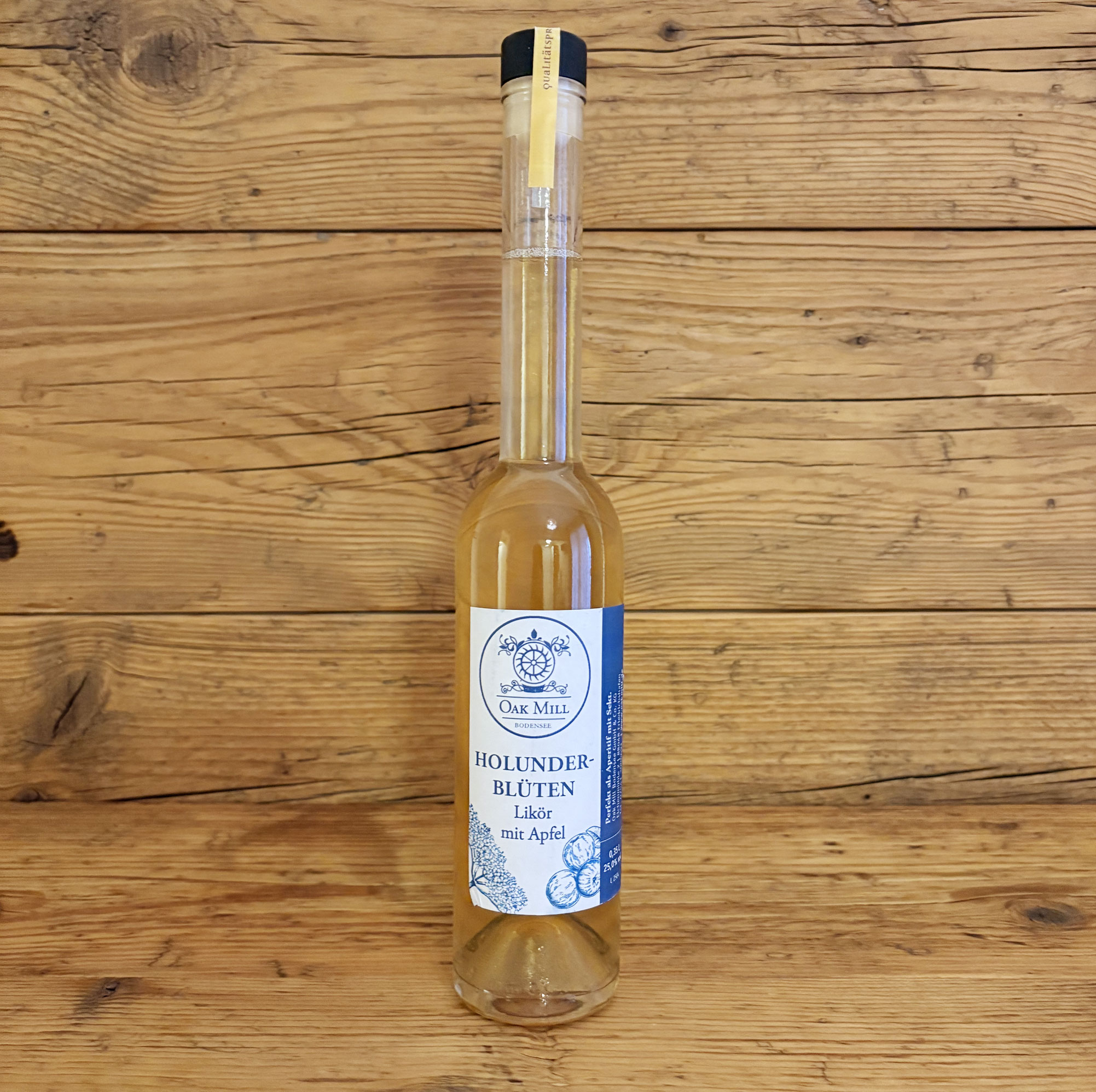 Aus Apfelbrand von ungespritzten Streuobstäpfeln mit handverlesenen Holunderblüten aus der Eichenmühle.